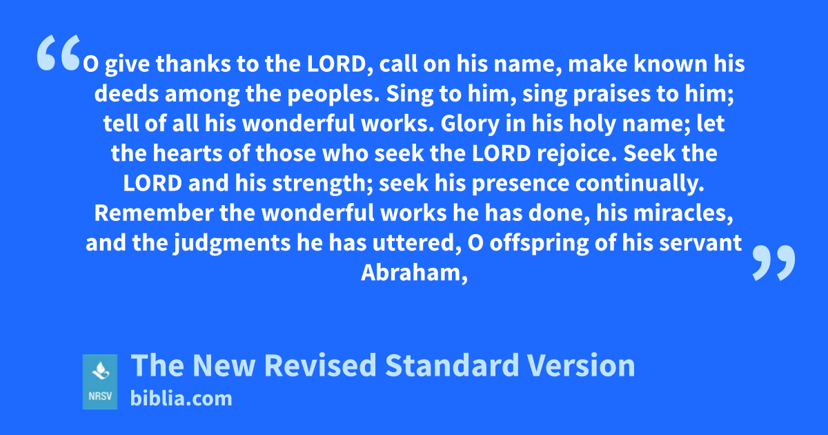 O give thanks to the LORD, call on his name, make known his deeds among the peoples. Sing to him, sing praises to him; tell of all his wonderful works. Glory in his holy name; let the hearts of those who seek the LORD rejoice. Seek the LORD and his strength; seek his presence continually. Remember the wonderful works he has done, his miracles, and the judgments he has uttered, O offspring of his servant Abraham,