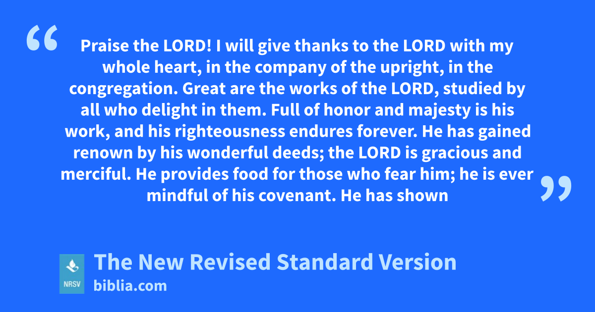 Praise the LORD! I will give thanks to the LORD with my whole heart, in the company of the upright, in the congregation. Great are the works of the LORD, studied by all who delight in them. Full of honor and majesty is his work, and his righteousness endures forever. He has gained renown by his wonderful deeds; the LORD is gracious and merciful. He provides food for those who fear him; he is ever mindful of his covenant. He has shown