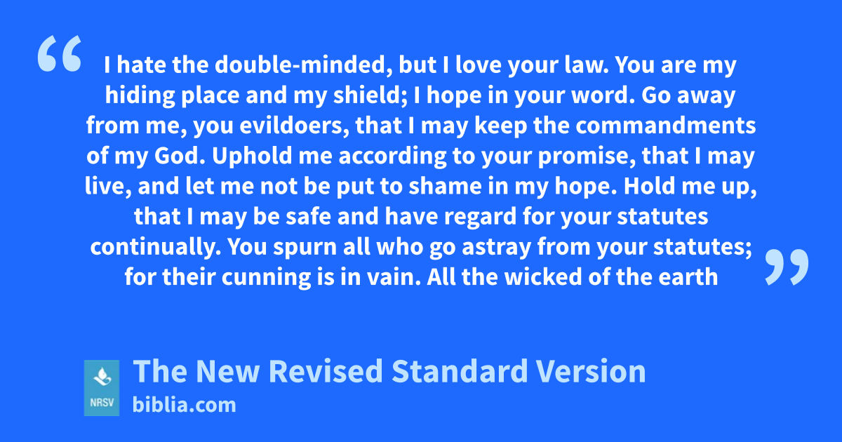 I hate the double-minded, but I love your law. You are my hiding place and my shield; I hope in your word. Go away from me, you evildoers, that I may keep the commandments of my God. Uphold me according to your promise, that I may live, and let me not be put to shame in my hope. Hold me up, that I may be safe and have regard for your statutes continually. You spurn all who go astray from your statutes; for their cunning is in vain. All the wicked of the earth