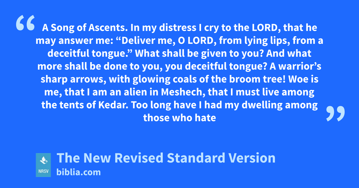 A Song of Ascents. In my distress I cry to the LORD, that he may answer me: “Deliver me, O LORD, from lying lips, from a deceitful tongue.” What shall be given to you? And what more shall be done to you, you deceitful tongue? A warrior’s sharp arrows, with glowing coals of the broom tree! Woe is me, that I am an alien in Meshech, that I must live among the tents of Kedar. Too long have I had my dwelling among those who hate