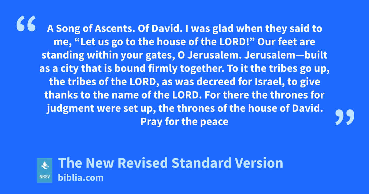 A Song of Ascents. Of David. I was glad when they said to me, “Let us go to the house of the LORD!” Our feet are standing within your gates, O Jerusalem. Jerusalem—built as a city that is bound firmly together. To it the tribes go up, the tribes of the LORD, as was decreed for Israel, to give thanks to the name of the LORD. For there the thrones for judgment were set up, the thrones of the house of David. Pray for the peace