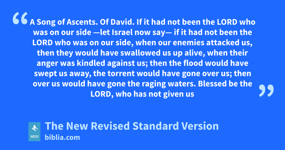 A Song of Ascents. Of David. If it had not been the LORD who was on our side —let Israel now say— if it had not been the LORD who was on our side, when our enemies attacked us, then they would have swallowed us up alive, when their anger was kindled against us; then the flood would have swept us away, the torrent would have gone over us; then over us would have gone the raging waters. Blessed be the LORD, who has not given us