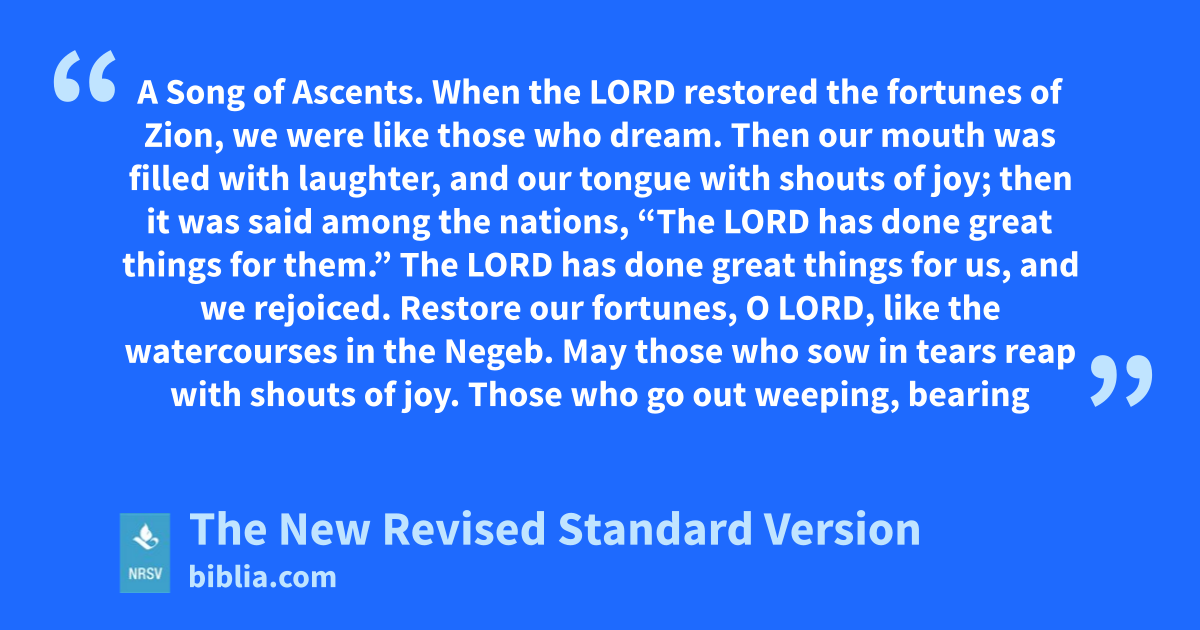 A Song of Ascents. When the LORD restored the fortunes of Zion, we were like those who dream. Then our mouth was filled with laughter, and our tongue with shouts of joy; then it was said among the nations, “The LORD has done great things for them.” The LORD has done great things for us, and we rejoiced. Restore our fortunes, O LORD, like the watercourses in the Negeb. May those who sow in tears reap with shouts of joy. Those who go out weeping, bearing