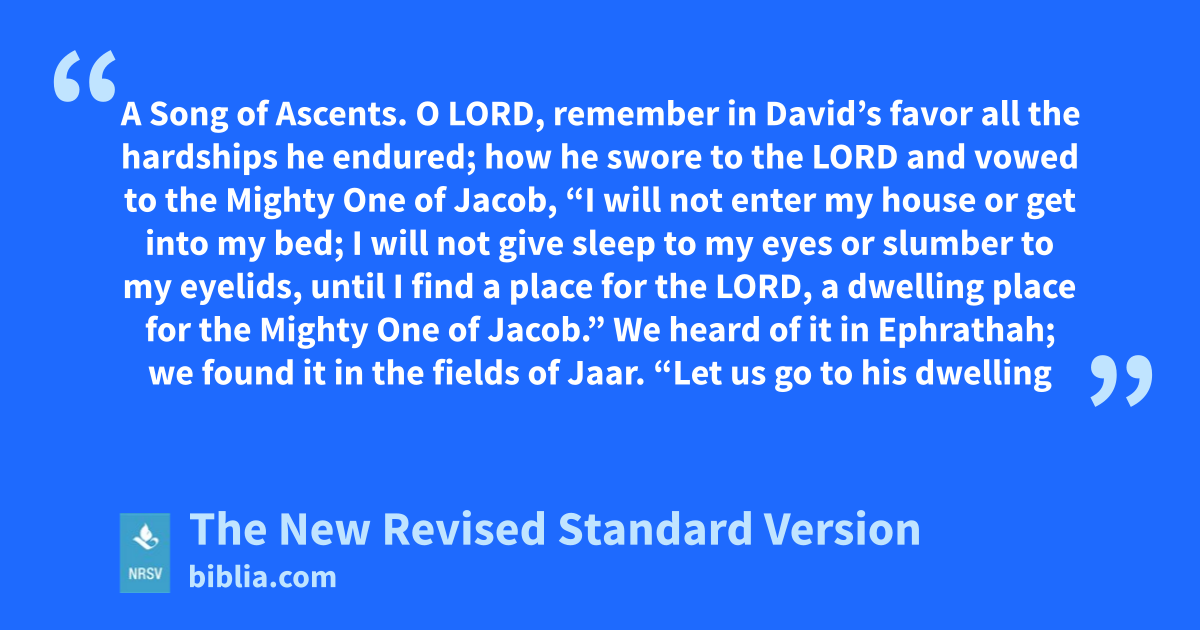 A Song of Ascents. O LORD, remember in David’s favor all the hardships he endured; how he swore to the LORD and vowed to the Mighty One of Jacob, “I will not enter my house or get into my bed; I will not give sleep to my eyes or slumber to my eyelids, until I find a place for the LORD, a dwelling place for the Mighty One of Jacob.” We heard of it in Ephrathah; we found it in the fields of Jaar. “Let us go to his dwelling