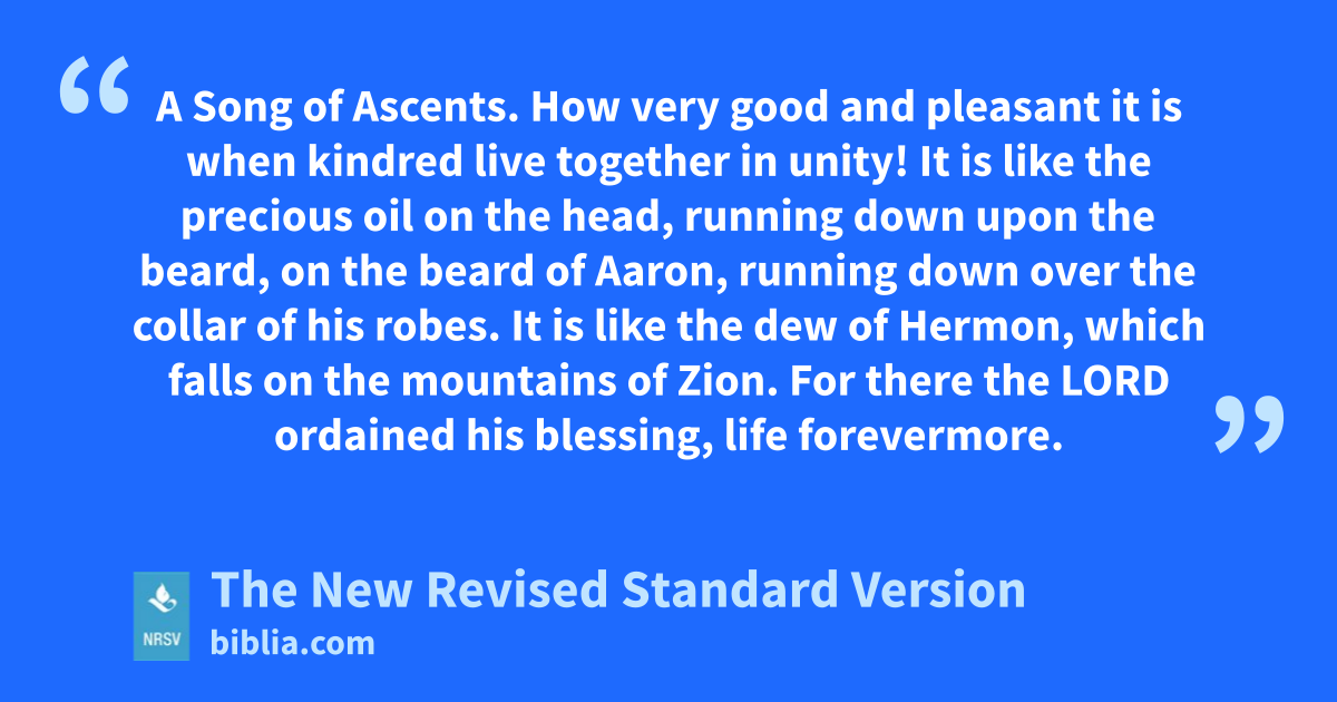 A Song of Ascents. How very good and pleasant it is when kindred live together in unity! It is like the precious oil on the head, running down upon the beard, on the beard of Aaron, running down over the collar of his robes. It is like the dew of Hermon, which falls on the mountains of Zion. For there the LORD ordained his blessing, life forevermore.