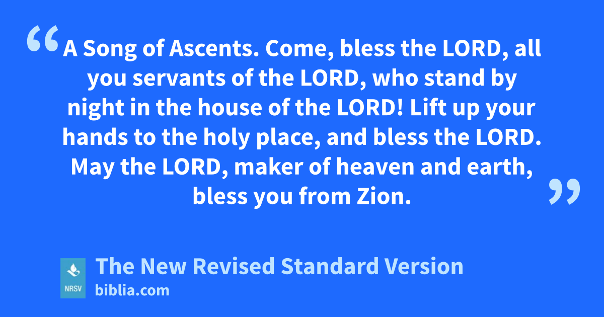 A Song of Ascents. Come, bless the LORD, all you servants of the LORD, who stand by night in the house of the LORD! Lift up your hands to the holy place, and bless the LORD. May the LORD, maker of heaven and earth, bless you from Zion.