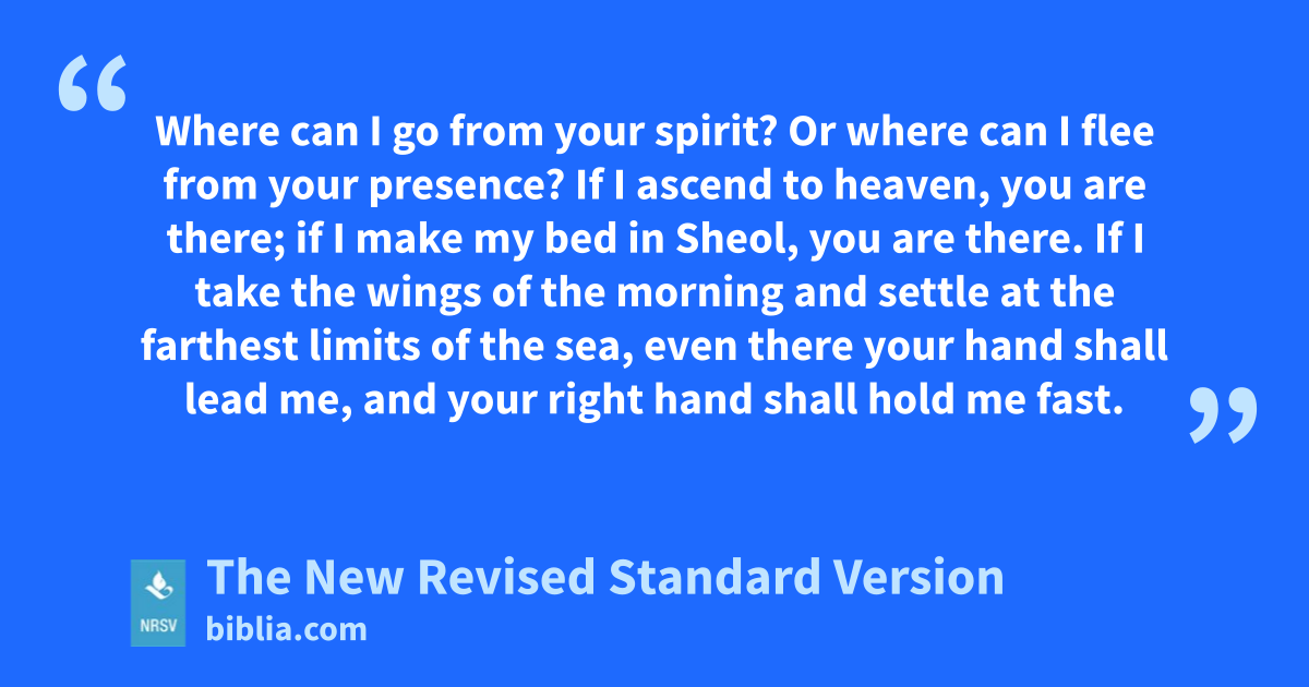 Where can I go from your spirit? Or where can I flee from your presence? If I ascend to heaven, you are there; if I make my bed in Sheol, you are there. If I take the wings of the morning and settle at the farthest limits of the sea, even there your hand shall lead me, and your right hand shall hold me fast.