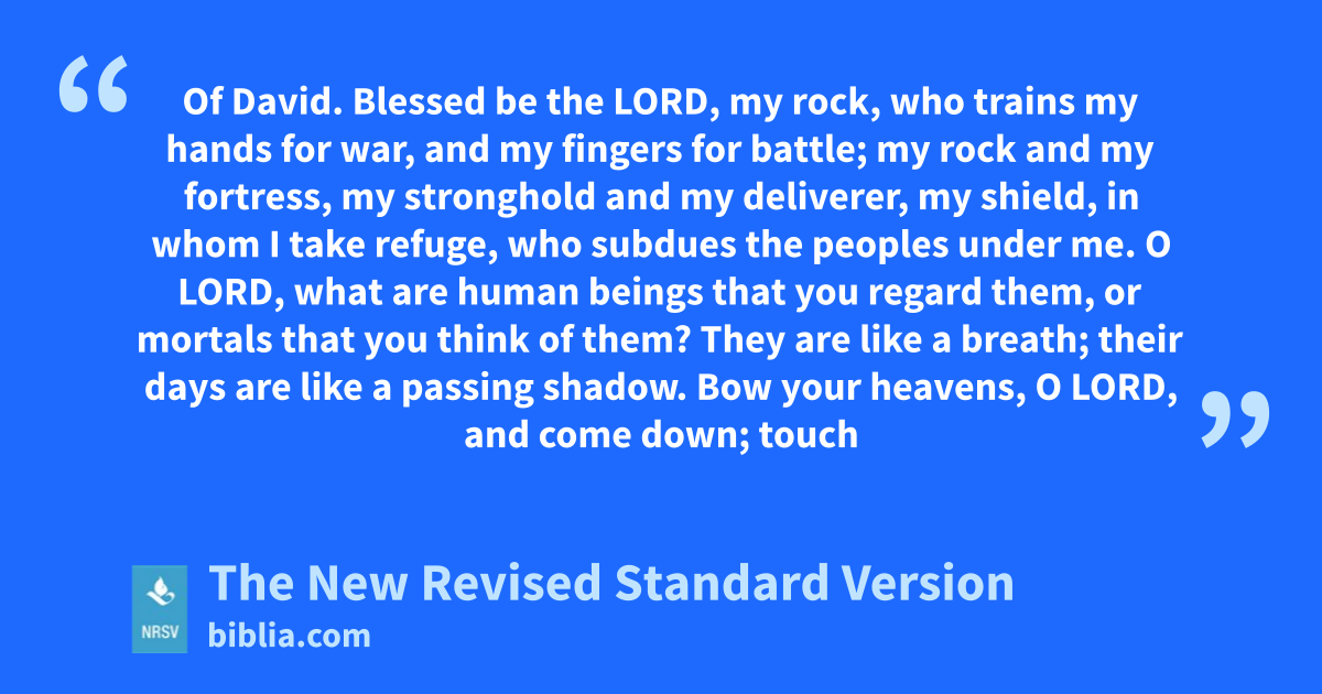 Of David. Blessed be the LORD, my rock, who trains my hands for war, and my fingers for battle; my rock and my fortress, my stronghold and my deliverer, my shield, in whom I take refuge, who subdues the peoples under me. O LORD, what are human beings that you regard them, or mortals that you think of them? They are like a breath; their days are like a passing shadow. Bow your heavens, O LORD, and come down; touch