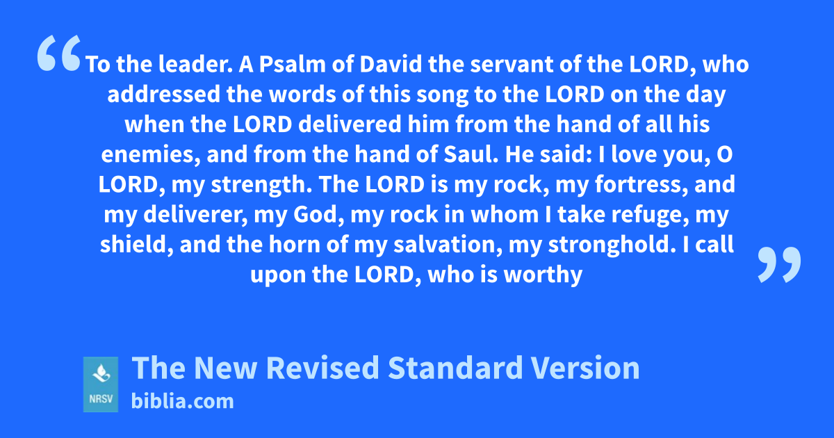 To the leader. A Psalm of David the servant of the LORD, who addressed the words of this song to the LORD on the day when the LORD delivered him from the hand of all his enemies, and from the hand of Saul. He said: I love you, O LORD, my strength. The LORD is my rock, my fortress, and my deliverer, my God, my rock in whom I take refuge, my shield, and the horn of my salvation, my stronghold. I call upon the LORD, who is worthy
