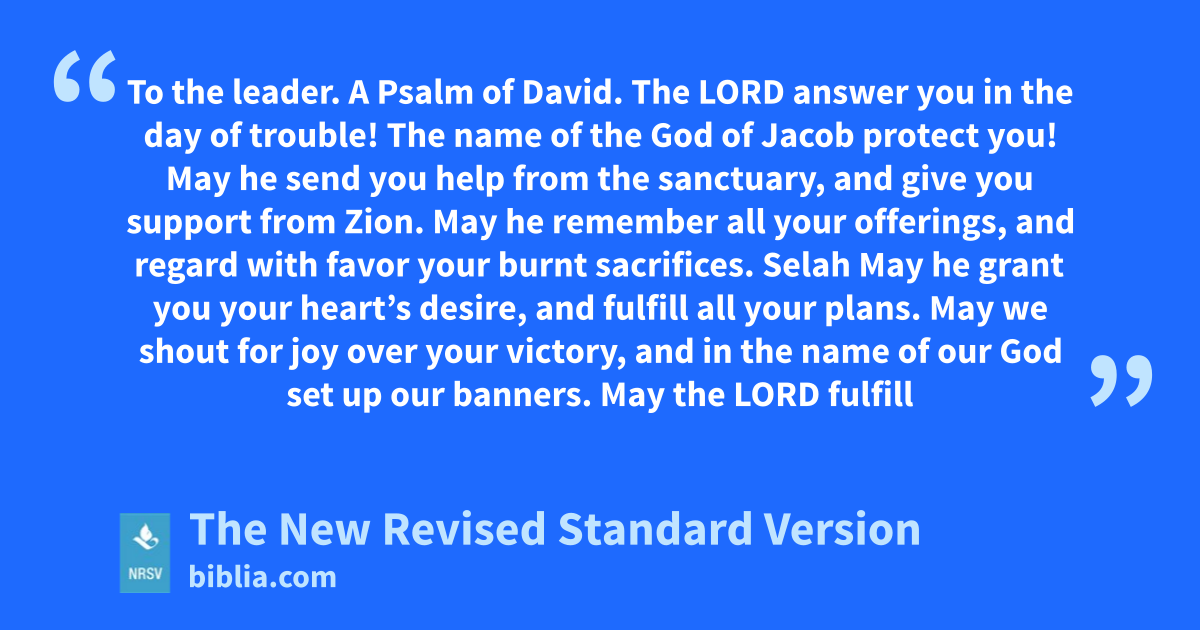 To the leader. A Psalm of David. The LORD answer you in the day of trouble! The name of the God of Jacob protect you! May he send you help from the sanctuary, and give you support from Zion. May he remember all your offerings, and regard with favor your burnt sacrifices. Selah May he grant you your heart’s desire, and fulfill all your plans. May we shout for joy over your victory, and in the name of our God set up our banners. May the LORD fulfill