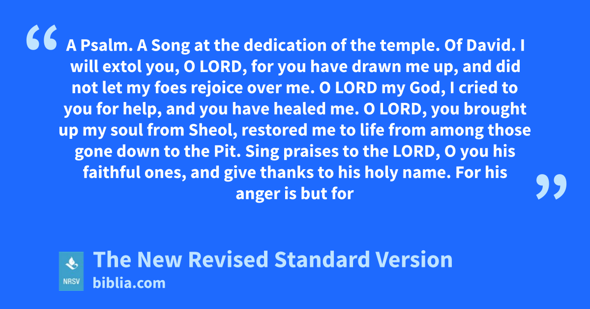 A Psalm. A Song at the dedication of the temple. Of David. I will extol you, O LORD, for you have drawn me up, and did not let my foes rejoice over me. O LORD my God, I cried to you for help, and you have healed me. O LORD, you brought up my soul from Sheol, restored me to life from among those gone down to the Pit. Sing praises to the LORD, O you his faithful ones, and give thanks to his holy name. For his anger is but for