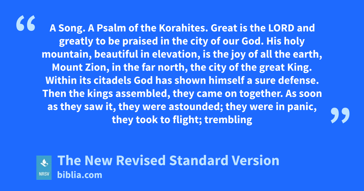 A Song. A Psalm of the Korahites. Great is the LORD and greatly to be praised in the city of our God. His holy mountain, beautiful in elevation, is the joy of all the earth, Mount Zion, in the far north, the city of the great King. Within its citadels God has shown himself a sure defense. Then the kings assembled, they came on together. As soon as they saw it, they were astounded; they were in panic, they took to flight; trembling