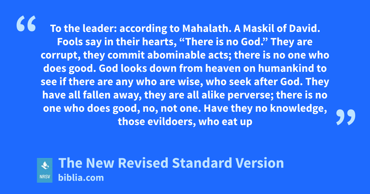 To the leader: according to Mahalath. A Maskil of David. Fools say in their hearts, “There is no God.” They are corrupt, they commit abominable acts; there is no one who does good. God looks down from heaven on humankind to see if there are any who are wise, who seek after God. They have all fallen away, they are all alike perverse; there is no one who does good, no, not one. Have they no knowledge, those evildoers, who eat up