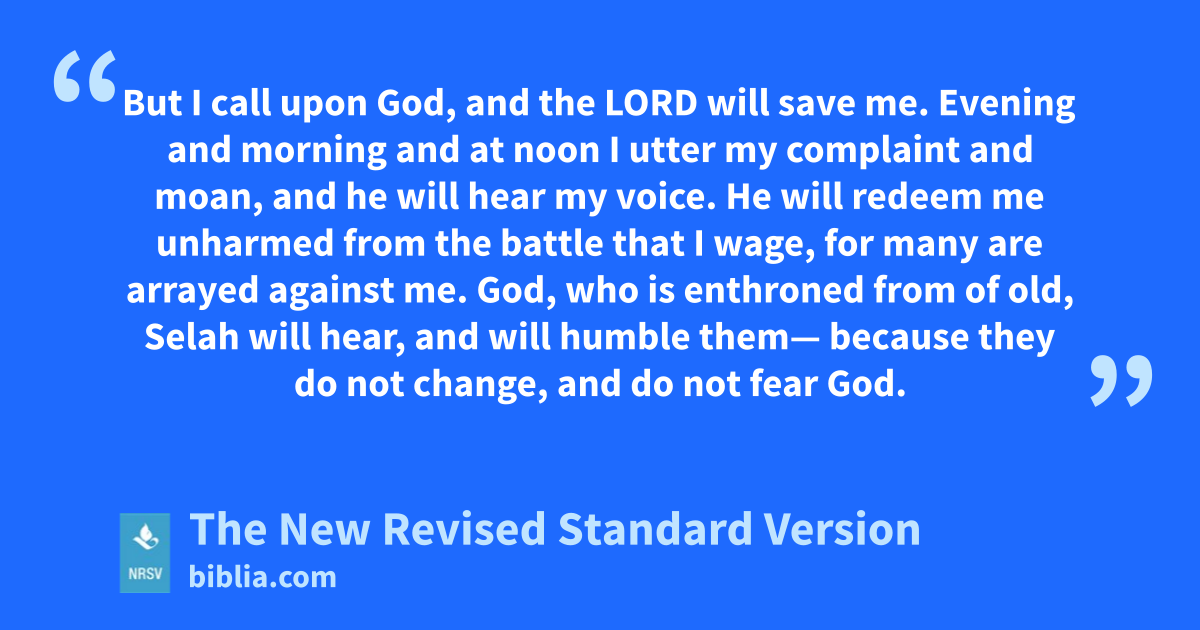 But I call upon God, and the LORD will save me. Evening and morning and at noon I utter my complaint and moan, and he will hear my voice. He will redeem me unharmed from the battle that I wage, for many are arrayed against me. God, who is enthroned from of old, Selah will hear, and will humble them— because they do not change, and do not fear God.
