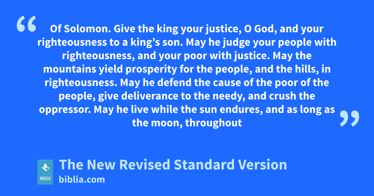 Of Solomon. Give the king your justice, O God, and your righteousness to a king’s son. May he judge your people with righteousness, and your poor with justice. May the mountains yield prosperity for the people, and the hills, in righteousness. May he defend the cause of the poor of the people, give deliverance to the needy, and crush the oppressor. May he live while the sun endures, and as long as the moon, throughout