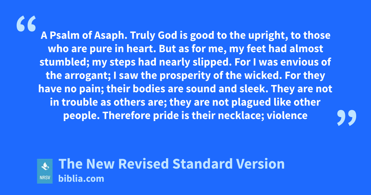 A Psalm of Asaph. Truly God is good to the upright, to those who are pure in heart. But as for me, my feet had almost stumbled; my steps had nearly slipped. For I was envious of the arrogant; I saw the prosperity of the wicked. For they have no pain; their bodies are sound and sleek. They are not in trouble as others are; they are not plagued like other people. Therefore pride is their necklace; violence