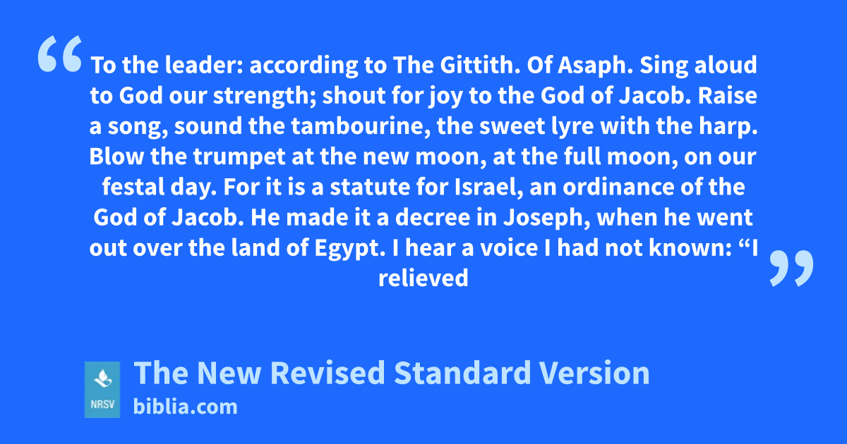 To the leader: according to The Gittith. Of Asaph. Sing aloud to God our strength; shout for joy to the God of Jacob. Raise a song, sound the tambourine, the sweet lyre with the harp. Blow the trumpet at the new moon, at the full moon, on our festal day. For it is a statute for Israel, an ordinance of the God of Jacob. He made it a decree in Joseph, when he went out over the land of Egypt. I hear a voice I had not known: “I relieved