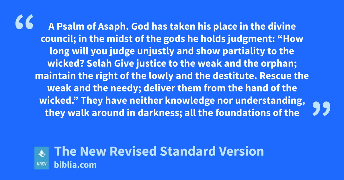 A Psalm of Asaph. God has taken his place in the divine council; in the midst of the gods he holds judgment: “How long will you judge unjustly and show partiality to the wicked? Selah Give justice to the weak and the orphan; maintain the right of the lowly and the destitute. Rescue the weak and the needy; deliver them from the hand of the wicked.” They have neither knowledge nor understanding, they walk around in darkness; all the foundations of the