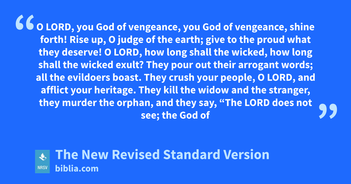 O LORD, you God of vengeance, you God of vengeance, shine forth! Rise up, O judge of the earth; give to the proud what they deserve! O LORD, how long shall the wicked, how long shall the wicked exult? They pour out their arrogant words; all the evildoers boast. They crush your people, O LORD, and afflict your heritage. They kill the widow and the stranger, they murder the orphan, and they say, “The LORD does not see; the God of