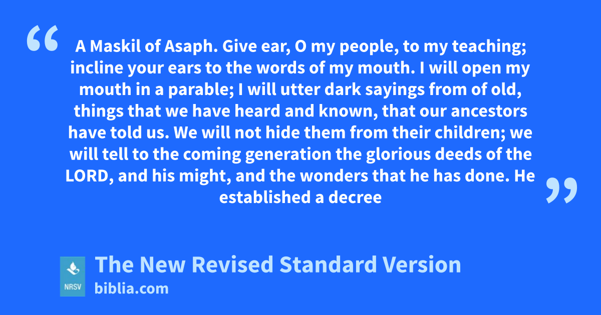 A Maskil of Asaph. Give ear, O my people, to my teaching; incline your ears to the words of my mouth. I will open my mouth in a parable; I will utter dark sayings from of old, things that we have heard and known, that our ancestors have told us. We will not hide them from their children; we will tell to the coming generation the glorious deeds of the LORD, and his might, and the wonders that he has done. He established a decree