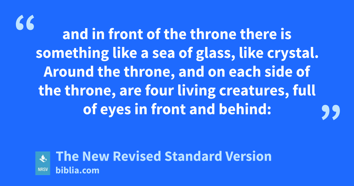 and in front of the throne there is something like a sea of glass, like crystal. Around the throne, and on each side of the throne, are four living creatures, full of eyes in front and behind: