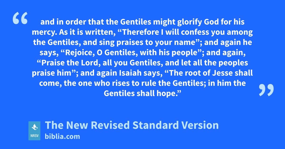 and in order that the Gentiles might glorify God for his mercy. As it is written, “Therefore I will confess you among the Gentiles, and sing praises to your name”; and again he says, “Rejoice, O Gentiles, with his people”; and again, “Praise the Lord, all you Gentiles, and let all the peoples praise him”; and again Isaiah says, “The root of Jesse shall come, the one who rises to rule the Gentiles; in him the Gentiles shall hope.”