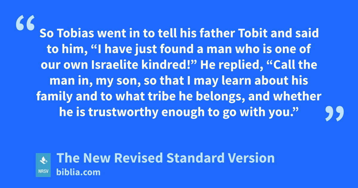So Tobias went in to tell his father Tobit and said to him, “I have just found a man who is one of our own Israelite kindred!” He replied, “Call the man in, my son, so that I may learn about his family and to what tribe he belongs, and whether he is trustworthy enough to go with you.”