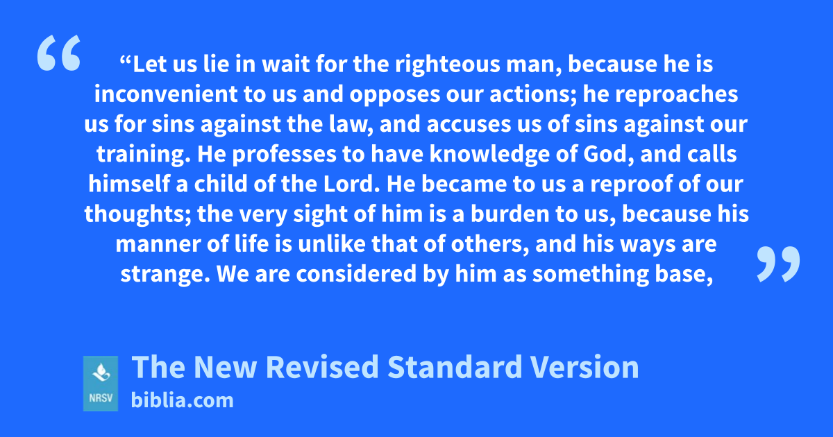 “Let us lie in wait for the righteous man, because he is inconvenient to us and opposes our actions; he reproaches us for sins against the law, and accuses us of sins against our training. He professes to have knowledge of God, and calls himself a child of the Lord. He became to us a reproof of our thoughts; the very sight of him is a burden to us, because his manner of life is unlike that of others, and his ways are strange. We are considered by him as something base,