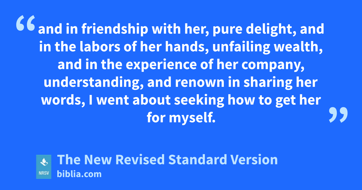 and in friendship with her, pure delight, and in the labors of her hands, unfailing wealth, and in the experience of her company, understanding, and renown in sharing her words, I went about seeking how to get her for myself.