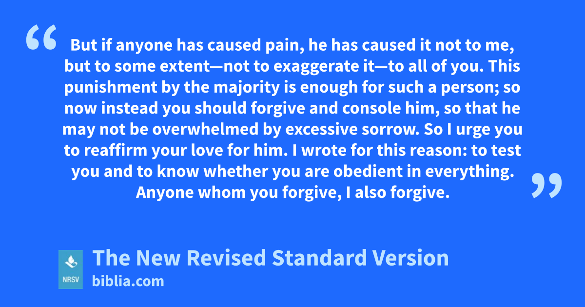 But if anyone has caused pain, he has caused it not to me, but to some extent—not to exaggerate it—to all of you. This punishment by the majority is enough for such a person; so now instead you should forgive and console him, so that he may not be overwhelmed by excessive sorrow. So I urge you to reaffirm your love for him. I wrote for this reason: to test you and to know whether you are obedient in everything. Anyone whom you forgive, I also forgive.