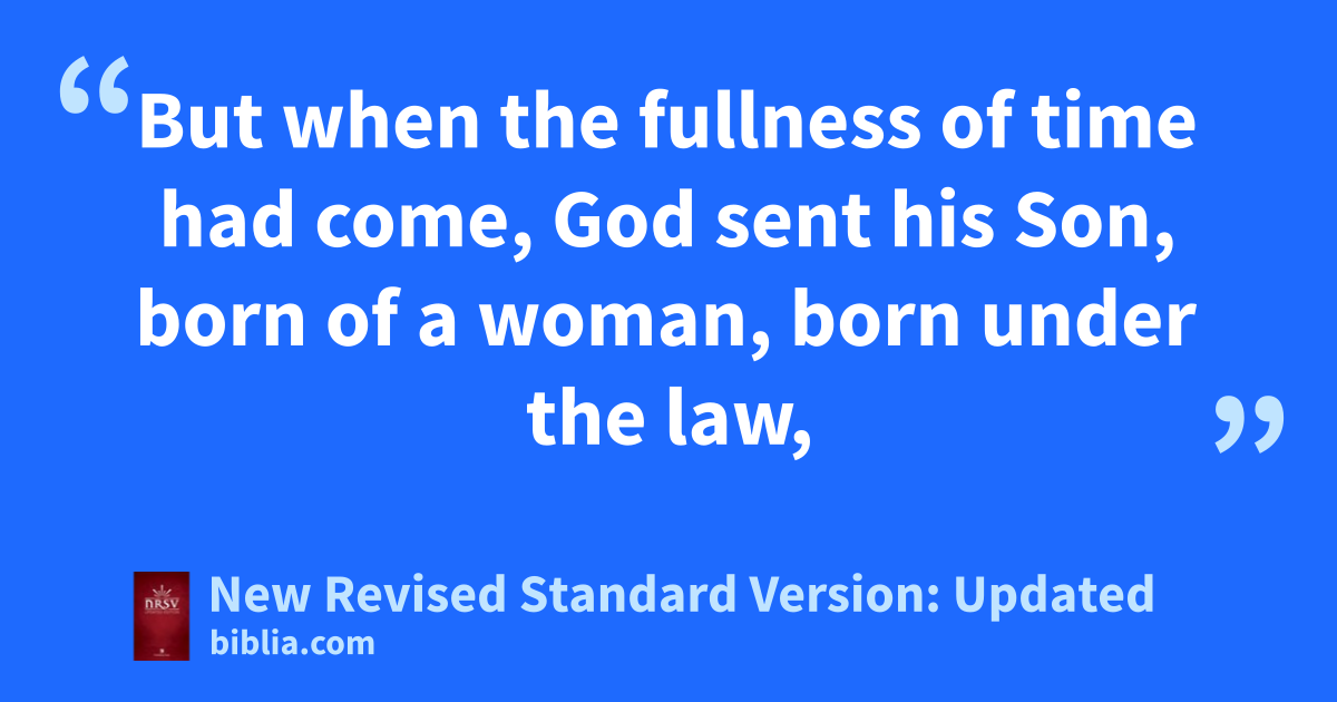 4 My point is this: heirs, as long as they are minors, are no better than those who are enslaved, though they are the owners of all the property, 2 but they remain under guardians and trustees until the date set by the father. 3 So with us; while we were minors, we were enslaved to the elemental principlesv of the world.* 4 But when the fullness of time had come, God sent his Son, born of a woman, born under the law,* 5 in order to redeem those who were under the law, so that we might receive adoption as children.* 6 And because you are children, God has sent the Spirit of his Son into ourw hearts, crying, “Abba!x Father!”* 7 So you are no longer a slave but a child, and if a child then also an heir through God.y