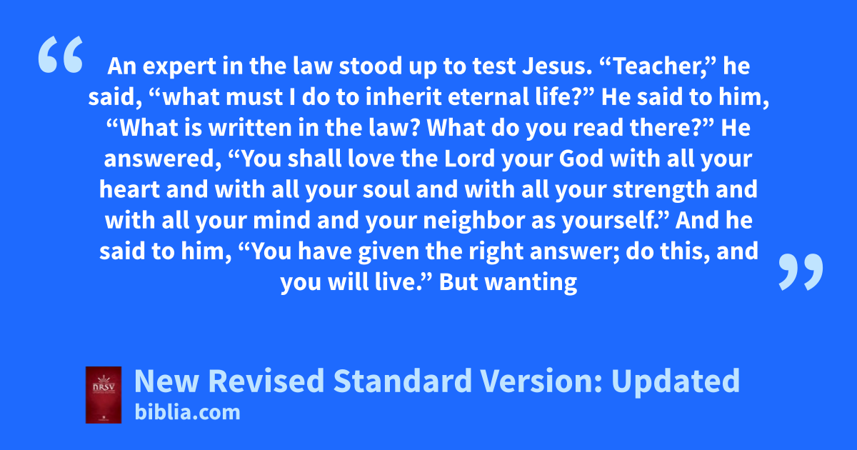 25 An expert in the law stood up to test Jesus.m “Teacher,” he said, “what must I do to inherit eternal life?”* 26 He said to him, “What is written in the law? What do you read there?” 27 He answered, “You shall love the Lord your God with all your heart and with all your soul and with all your strength and with all your mind and your neighbor as yourself.”* 28 And he said to him, “You have given the right answer; do this, and you will live.”*