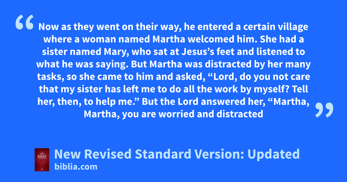 38 Now as they went on their way, he entered a certain village where a woman named Martha welcomed him.n,* 39 She had a sister named Mary, who sat at Jesus’so feet and listened to what he was saying.* 40 But Martha was distracted by her many tasks, so she came to him and asked, “Lord, do you not care that my sister has left me to do all the work by myself? Tell her, then, to help me.” 41 But the Lord answered her, “Martha, Martha, you are worried and distracted by many things, 42 but few things are needed—indeed only one.p Mary has chosen the better part, which will not be taken away from her.”*