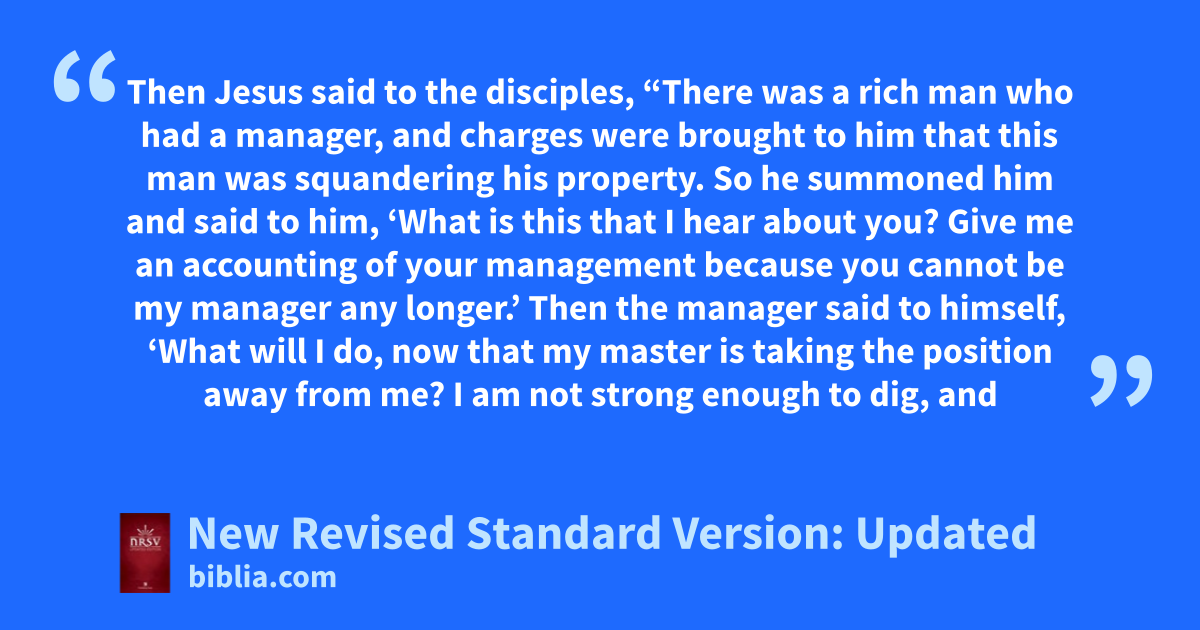 16 Then Jesusx said to the disciples, “There was a rich man who had a manager, and charges were brought to him that this man was squandering his property.* 2 So he summoned him and said to him, ‘What is this that I hear about you? Give me an accounting of your management because you cannot be my manager any longer.’ 3 Then the manager said to himself, ‘What will I do, now that my master is taking the position away from me? I am not strong enough to dig, and I am ashamed to beg. 4 I have decided what to do so that, when I am dismissed as manager, people may welcome me into their homes.’ 5 So, summoning his master’s debtors one by one, he asked the first, ‘How much do you owe my master?’ 6 He answered, ‘A hundred jugs of olive oil.’ He said to him, ‘Take your bill, sit down quickly, and make it fifty.’ 7 Then he asked another, ‘And how much do you owe?’ He replied, ‘A hundred containers of wheat.’ He said to him, ‘Take your bill and make it eighty.’ 8 And his master commended the dishonest manager because he had acted shrewdly, for the children of this age are more shrewd in dealing with their own generation than are the children of light.* 9 And I tell you, make friends for yourselves by means of dishonest wealthy so that when it is gone they may welcome you into the eternal homes.z,*