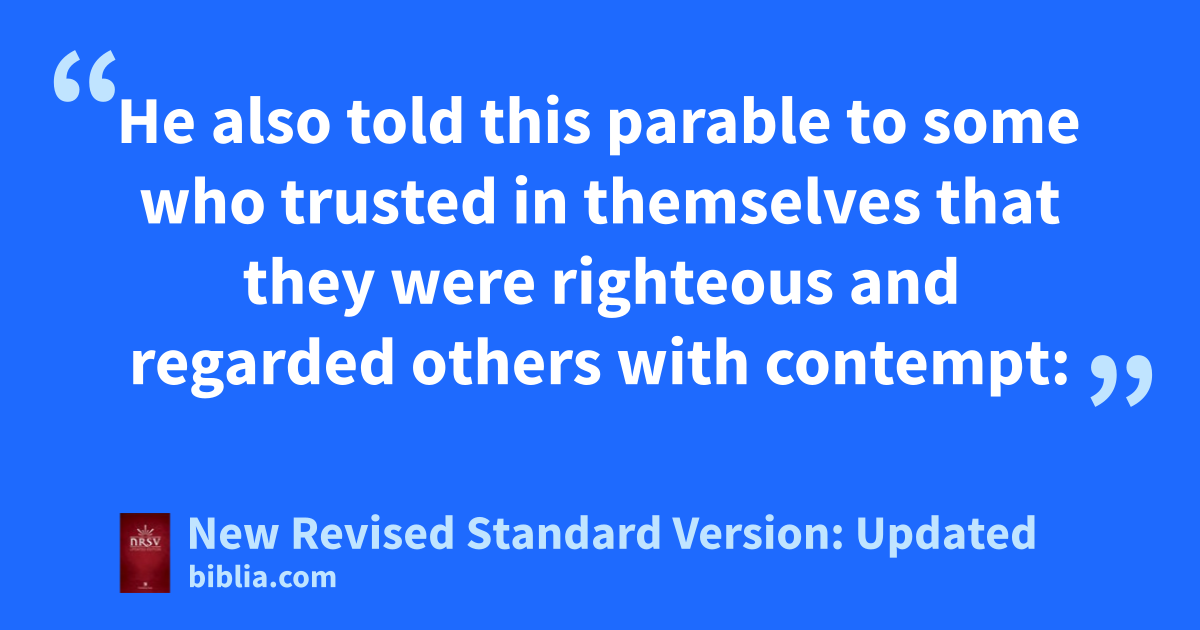 9 He also told this parable to some who trusted in themselves that they were righteous and regarded others with contempt: 10 “Two men went up to the temple to pray, one a Pharisee and the other a tax collector. 11 The Pharisee, standing by himself, was praying thus, ‘God, I thank you that I am not like other people: thieves, rogues, adulterers, or even like this tax collector. 12 I fast twice a week; I give a tenth of all my income.’* 13 But the tax collector, standing far off, would not even lift up his eyes to heaven but was beating his breast and saying, ‘God, be merciful to me, a sinner!’* 14 I tell you, this man went down to his home justified rather than the other, for all who exalt themselves will be humbled, but all who humble themselves will be exalted.”*