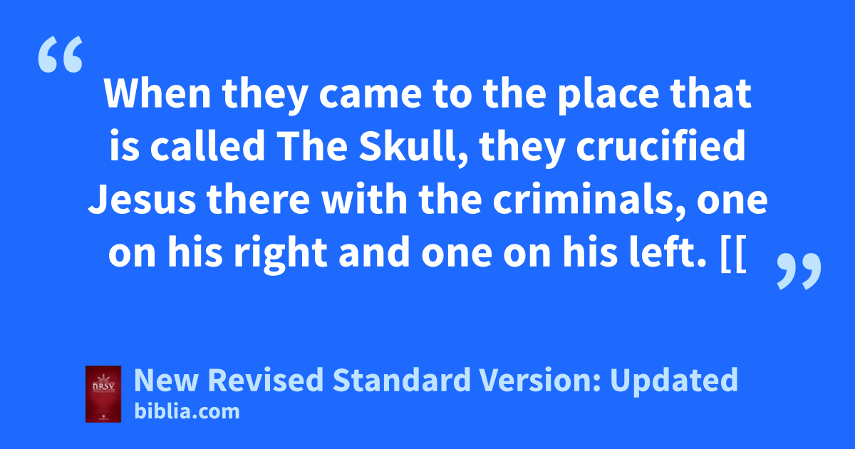 32 Two others also, who were criminals, were led away to be put to death with him.* 33 When they came to the place that is called The Skull, they crucified Jesusv there with the criminals, one on his right and one on his left. [[34 Then Jesus said, “Father, forgive them, for they do not know what they are doing.”]]w And they cast lots to divide his clothing.* 35 And the people stood by watching, but the leaders scoffed at him, saying, “He saved others; let him save himself if he is the Messiahx of God, his chosen one!”* 36 The soldiers also mocked him, coming up and offering him sour wine* 37 and saying, “If you are the King of the Jews, save yourself!” 38 There was also an inscription over him,y “This is the King of the Jews.”