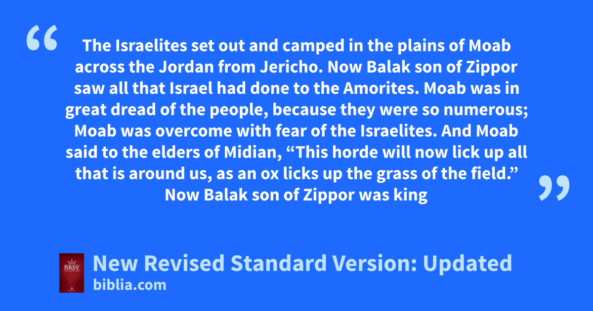 22 The Israelites set out and camped in the plains of Moab across the Jordan from Jericho.* 2 Now Balak son of Zippor saw all that Israel had done to the Amorites. 3 Moab was in great dread of the people, because they were so numerous; Moab was overcome with fear of the Israelites.* 4 And Moab said to the elders of Midian, “This horde will now lick up all that is around us, as an ox licks up the grass of the field.” Now Balak son of Zippor was king of Moab at that time.* 5 He sent messengers to Balaam son of Beor at Pethor, which is on the Euphrates,c in the land of Amaw,d to summon him, saying, “A people has come out of Egypt; they have spread over the face of the earth, and they have settled next to me.* 6 Come now, curse this people for me, since they are stronger than I; perhaps I shall be able to defeat them and drive them from the land, for I know that whomever you bless is blessed, and whomever you curse is cursed.”*