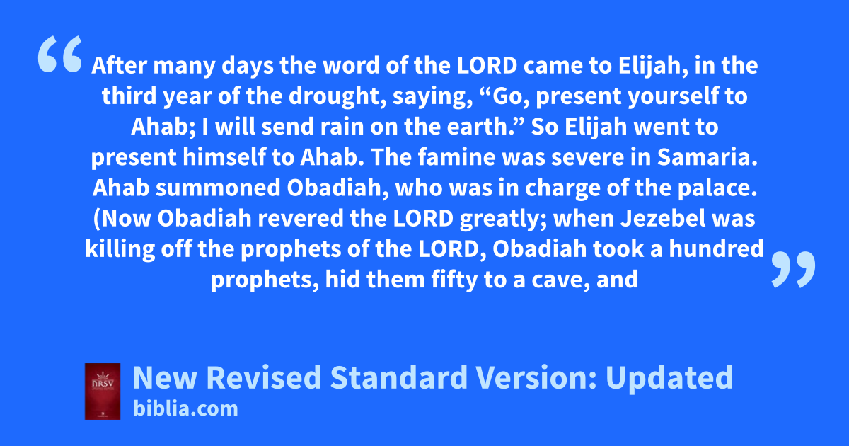 18 After many days the word of the Lord came to Elijah, in the third year of the drought,d saying, “Go, present yourself to Ahab; I will send rain on the earth.”* 2 So Elijah went to present himself to Ahab. The famine was severe in Samaria. 3 Ahab summoned Obadiah, who was in charge of the palace. (Now Obadiah revered the Lord greatly; 4 when Jezebel was killing off the prophets of the Lord, Obadiah took a hundred prophets, hid them fifty to a cave, and provided them with bread and water.)* 5 Then Ahab said to Obadiah, “Go through the land to all the springs of water and to all the wadis; perhaps we may find grass to keep the horses and mules alive and not lose some of the animals.” 6 So they divided the land between them to pass through it; Ahab went in one direction by himself, and Obadiah went in another direction by himself.