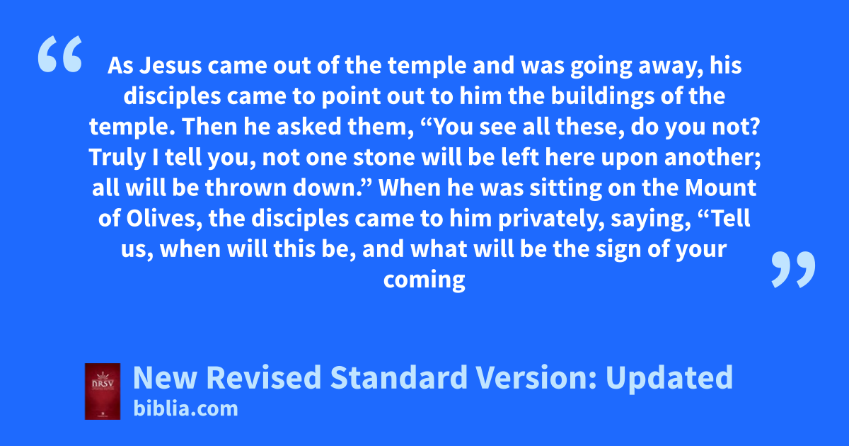 24 As Jesus came out of the temple and was going away, his disciples came to point out to him the buildings of the temple.* 2 Then he asked them, “You see all these, do you not? Truly I tell you, not one stone will be left here upon another; all will be thrown down.”*