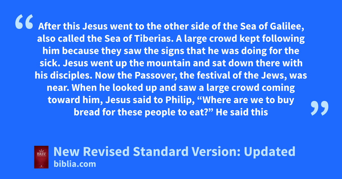 6 After this Jesus went to the other side of the Sea of Galilee, also called the Sea of Tiberias.b 2 A large crowd kept following him because they saw the signs that he was doing for the sick. 3 Jesus went up the mountain and sat down there with his disciples. 4 Now the Passover, the festival of the Jews, was near. 5 When he looked up and saw a large crowd coming toward him, Jesus said to Philip, “Where are we to buy bread for these people to eat?”* 6 He said this to test him, for he himself knew what he was going to do. 7 Philip answered him, “Two hundred denarii would not buy enough bread for each of them to get a little.” 8 One of his disciples, Andrew, Simon Peter’s brother, said to him, 9 “There is a boy here who has five barley loaves and two fish. But what are they among so many people?” 10 Jesus said, “Make the people sit down.” Now there was a great deal of grass in the place, so theyc sat down, about five thousand in all. 11 Then Jesus took the loaves, and when he had given thanks he distributed them to those who were seated; so also the fish, as much as they wanted.* 12 When they were satisfied, he told his disciples, “Gather up the fragments left over, so that nothing may be lost.” 13 So they gathered them up, and from the fragments of the five barley loaves, left by those who had eaten, they filled twelve baskets. 14 When the people saw the sign that he had done, they began to say, “This is indeed the prophet who is to come into the world.”*