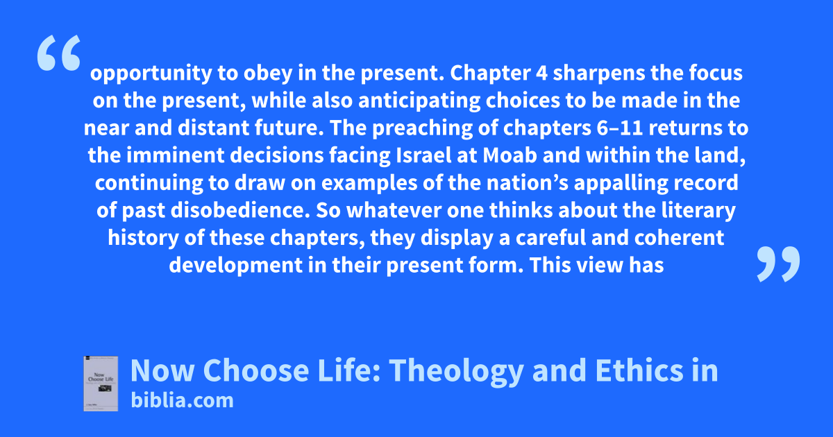 opportunity to obey in the present. Chapter 4 sharpens the focus on the present, while also anticipating choices to be made in the near and distant future. The preaching of chapters 6–11 returns to the imminent decisions facing Israel at Moab and within the land, continuing to draw on examples of the nation’s appalling record of past disobedience. So whatever one thinks about the literary history of these chapters, they display a careful and coherent development in their present form. This view has