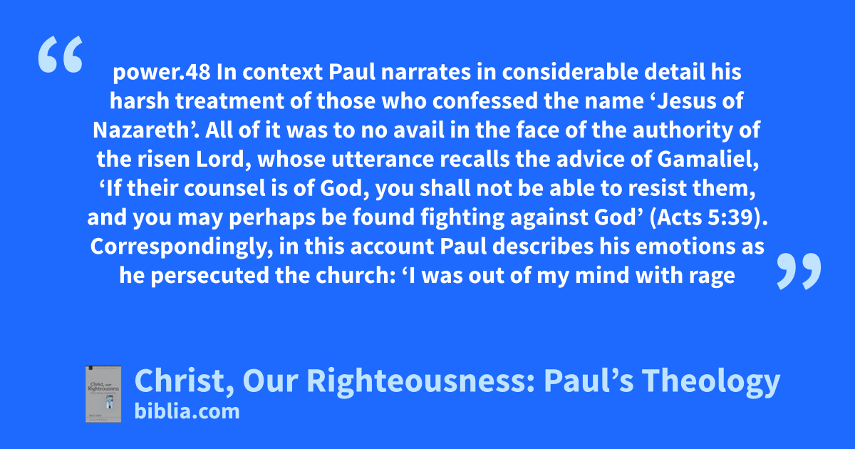 power.48 In context Paul narrates in considerable detail his harsh treatment of those who confessed the name ‘Jesus of Nazareth’. All of it was to no avail in the face of the authority of the risen Lord, whose utterance recalls the advice of Gamaliel, ‘If their counsel is of God, you shall not be able to resist them, and you may perhaps be found fighting against God’ (Acts 5:39). Correspondingly, in this account Paul describes his emotions as he persecuted the church: ‘I was out of my mind with rage