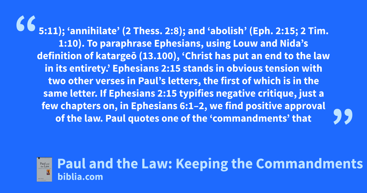 5:11); ‘annihilate’ (2 Thess. 2:8); and ‘abolish’ (Eph. 2:15; 2 Tim. 1:10). To paraphrase Ephesians, using Louw and Nida’s definition of katargeō (13.100), ‘Christ has put an end to the law in its entirety.’ Ephesians 2:15 stands in obvious tension with two other verses in Paul’s letters, the first of which is in the same letter. If Ephesians 2:15 typifies negative critique, just a few chapters on, in Ephesians 6:1–2, we find positive approval of the law. Paul quotes one of the ‘commandments’ that