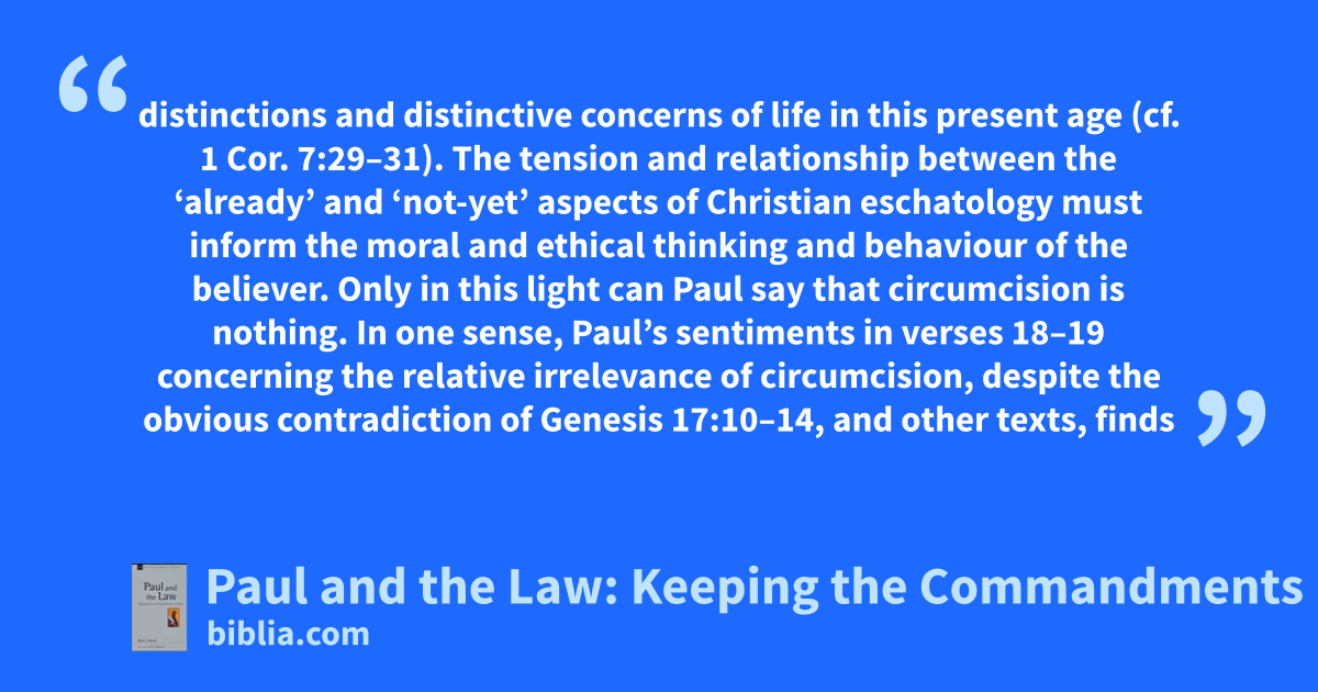 distinctions and distinctive concerns of life in this present age (cf. 1 Cor. 7:29–31). The tension and relationship between the ‘already’ and ‘not-yet’ aspects of Christian eschatology must inform the moral and ethical thinking and behaviour of the believer. Only in this light can Paul say that circumcision is nothing. In one sense, Paul’s sentiments in verses 18–19 concerning the relative irrelevance of circumcision, despite the obvious contradiction of Genesis 17:10–14, and other texts, finds