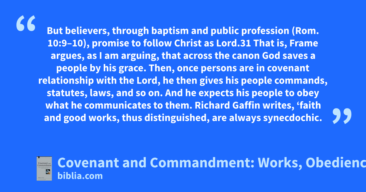 But believers, through baptism and public profession (Rom. 10:9–10), promise to follow Christ as Lord.31 That is, Frame argues, as I am arguing, that across the canon God saves a people by his grace. Then, once persons are in covenant relationship with the Lord, he then gives his people commands, statutes, laws, and so on. And he expects his people to obey what he communicates to them. Richard Gaffin writes, ‘faith and good works, thus distinguished, are always synecdochic.