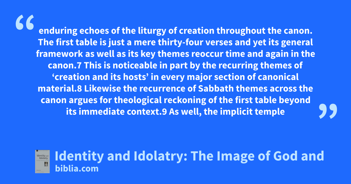 enduring echoes of the liturgy of creation throughout the canon. The first table is just a mere thirty-four verses and yet its general framework as well as its key themes reoccur time and again in the canon.7 This is noticeable in part by the recurring themes of ‘creation and its hosts’ in every major section of canonical material.8 Likewise the recurrence of Sabbath themes across the canon argues for theological reckoning of the first table beyond its immediate context.9 As well, the implicit temple