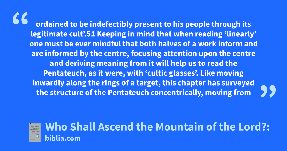 ordained to be indefectibly present to his people through its legitimate cult’.51 Keeping in mind that when reading ‘linearly’ one must be ever mindful that both halves of a work inform and are informed by the centre, focusing attention upon the centre and deriving meaning from it will help us to read the Pentateuch, as it were, with ‘cultic glasses’. Like moving inwardly along the rings of a target, this chapter has surveyed the structure of the Pentateuch concentrically, moving from