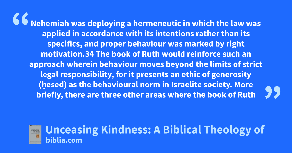 Nehemiah was deploying a hermeneutic in which the law was applied in accordance with its intentions rather than its specifics, and proper behaviour was marked by right motivation.34 The book of Ruth would reinforce such an approach wherein behaviour moves beyond the limits of strict legal responsibility, for it presents an ethic of generosity (ḥesed) as the behavioural norm in Israelite society. More briefly, there are three other areas where the book of Ruth