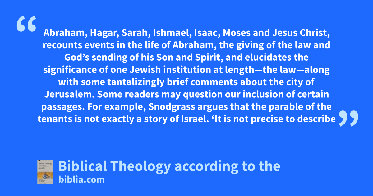 Abraham, Hagar, Sarah, Ishmael, Isaac, Moses and Jesus Christ, recounts events in the life of Abraham, the giving of the law and God’s sending of his Son and Spirit, and elucidates the significance of one Jewish institution at length—the law—along with some tantalizingly brief comments about the city of Jerusalem. Some readers may question our inclusion of certain passages. For example, Snodgrass argues that the parable of the tenants is not exactly a story of Israel. ‘It is not precise to describe