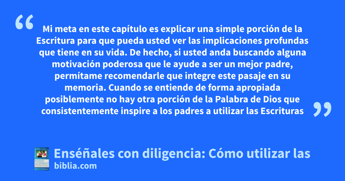 Mi meta en este capítulo es explicar una simple porción de la Escritura para que pueda usted ver las implicaciones profundas que tiene en su vida. De hecho, si usted anda buscando alguna motivación poderosa que le ayude a ser un mejor padre, permítame recomendarle que integre este pasaje en su memoria. Cuando se entiende de forma apropiada posiblemente no hay otra porción de la Palabra de Dios que consistentemente inspire a los padres a utilizar las Escrituras